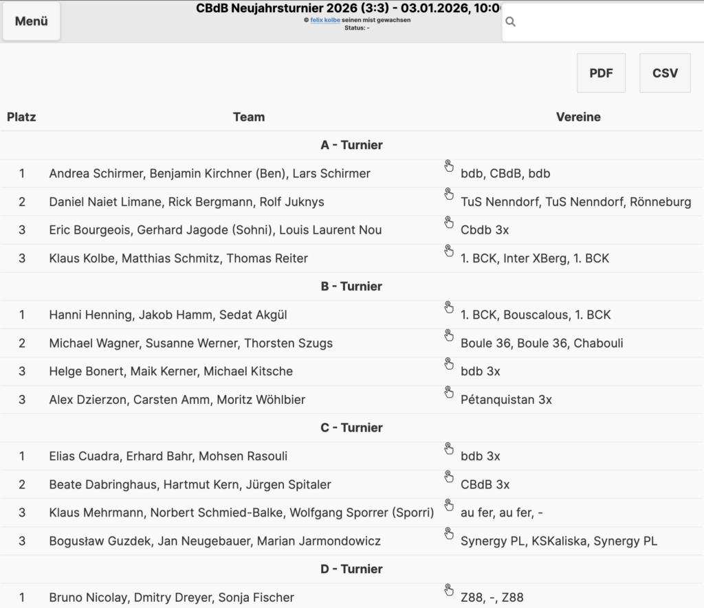 Die Ergebnisse vom Spieltag könnt ihr hier einsehen.https://www.xn--ptanque-bya.org/#dialog_selectTurnier