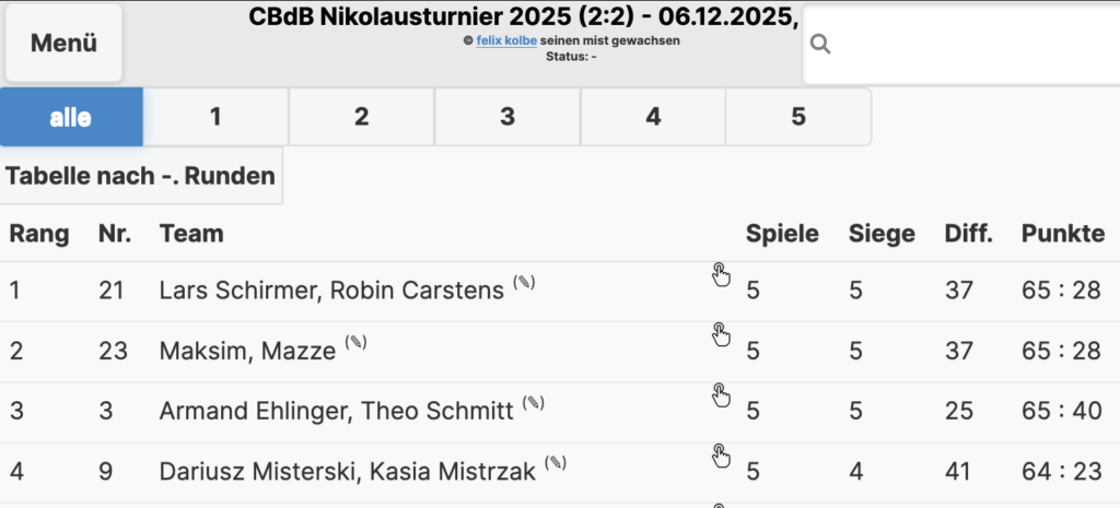 Ergebnisse, Bilder könnt ihr in der Turniersoftware bzw. der Seite Turnierergebnisse einsehen.
